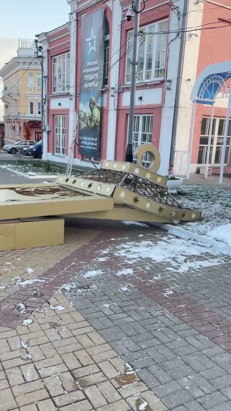 В Ельце мощный порыв ветра повалил массивную новогоднюю конструкцию — праздничный портал. Инцидент произошёл на одной из центральных улиц.