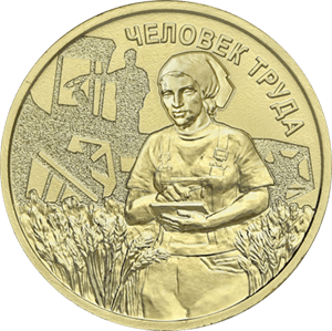 На оборотной стороне монеты находится рельефное изображение работницы сельского хозяйства среди колосьев на фоне изображения механизатора, стоящего на подножке комбайна; вверху справа по окружности красуется надпись: «ЧЕЛОВЕК ТРУДА».