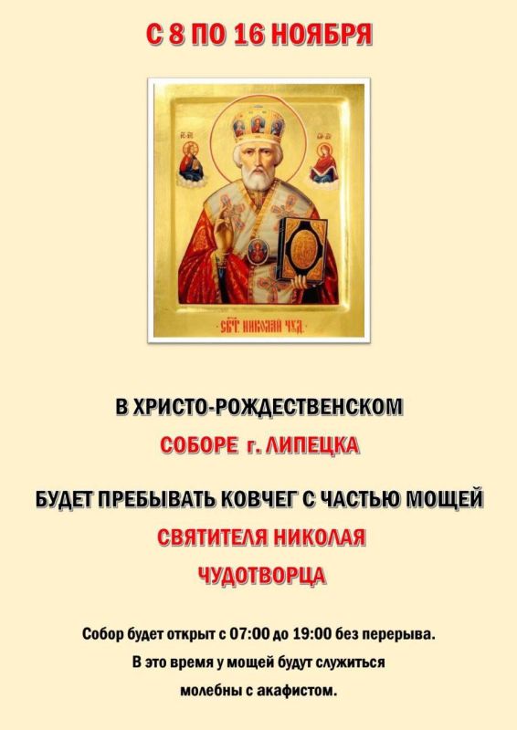 Великая христианская святыня — ковчег с частицей мощей святителя Николая Чудотворца — будет привезена в Липецк. Торжественная встреча реликвии состоится 8 ноября в 16:30 в Христо-Рождественском кафедральном соборе. У липчан и гостей города будет уникальная возможность поклониться мощам одного из самых почитаемых святых вплоть до 16 ноября.