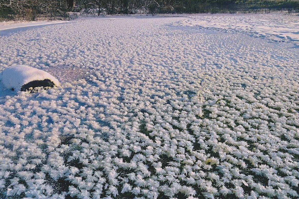 Эти изящные кристаллические «бутоны» рождаются в строгих условиях: на тонком, молодом льду, когда воздух над ним становится ледяным, а вода под ним ещё хранит тепло. Разница температур заставляет влагу буквально выдыхаться из полыньи и мгновенно застывать на морозе, сплетаясь в удивительные формы.