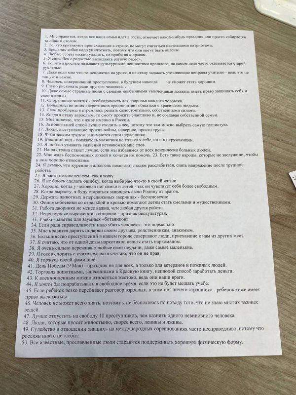 Содержание анкет вызвало вопросы у школьников и их родителей: в списке присутствуют тезисы, касающиеся межнациональных отношений, патриотизма, справедливости и социальных проблем