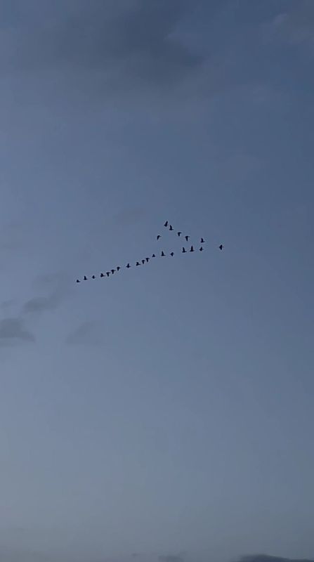 Как рассказали очевидцы, гуси летели высоко в небе, выстроившись характерным «клином». Такое построение позволяет птицам экономить силы во время дальнего перелёта: впереди летит вожак, за ним — остальные, используя восходящие потоки воздуха от крыльев лидера.