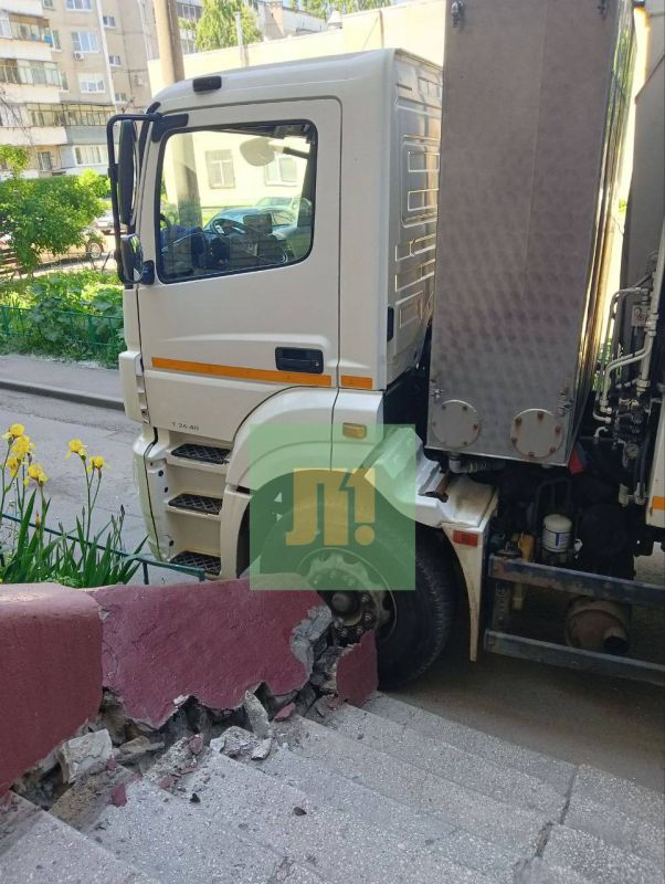 В Липецке на улице Гагарина, 8 произошло ЧП. Мусоровоз задел парапет подъезда. Удар вызвал серьезные разрушения.