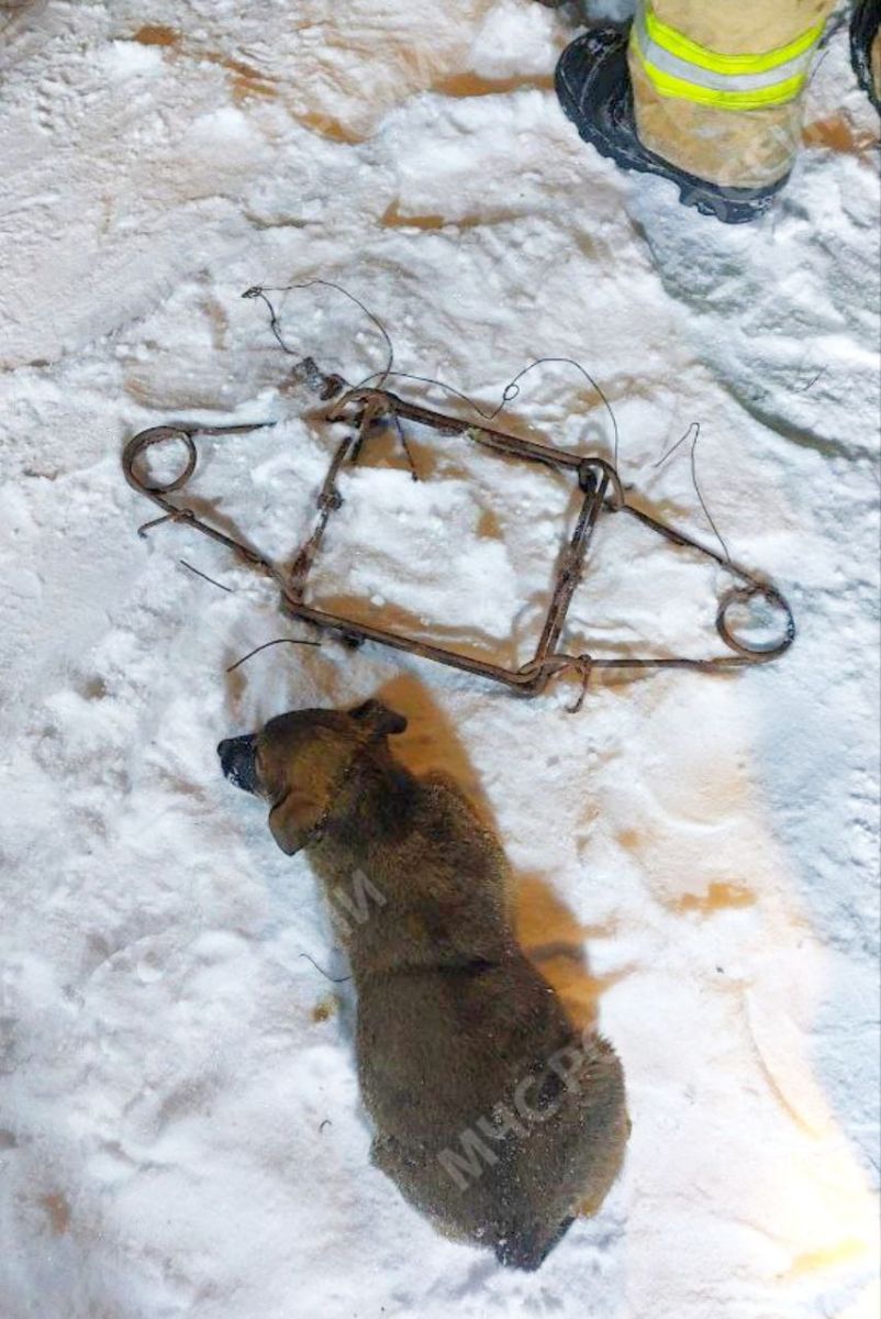 Во время тушения пожарные обнаружили щенка, который застрял в капкане. Спасатели быстро освободили животное и вернули его матери.